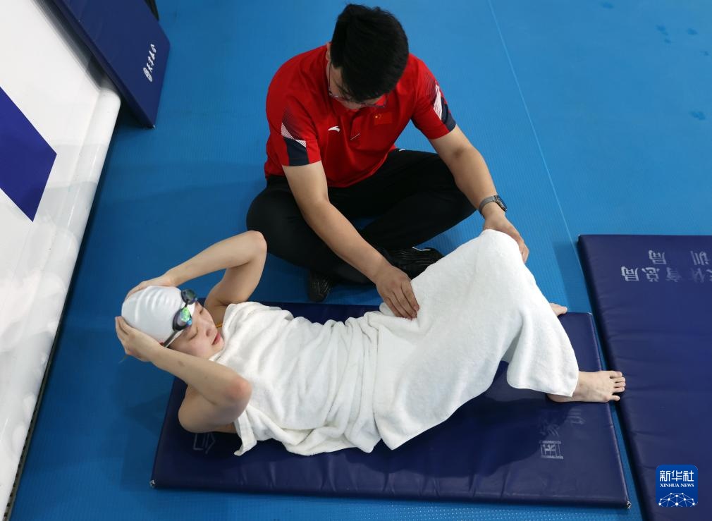 1月25日,中國游泳隊隊員馬永慧(下)在訓練后接受按摩。新華社記者 雒圓 攝