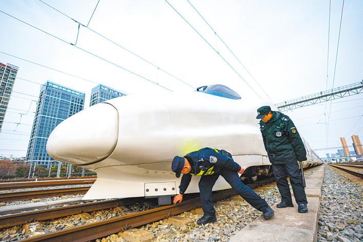 走出警務區(qū),凜冽的寒風瞬間襲來。李銘將警服拉鏈拉至最高,帶著一名保安隊員走向停車道。沿路上,李銘仔細查看軌道兩側,還不時檢查停放的動車組車門是否鎖好。“我天天都守在漢口車間這邊,一天下來總要來回巡邏幾趟。雖然現(xiàn)在鐵路沿線都實現(xiàn)了封閉管理,還有幾天就春運了,還是不能放松。”說罷,李銘搓了搓有些微微凍紅的雙手。