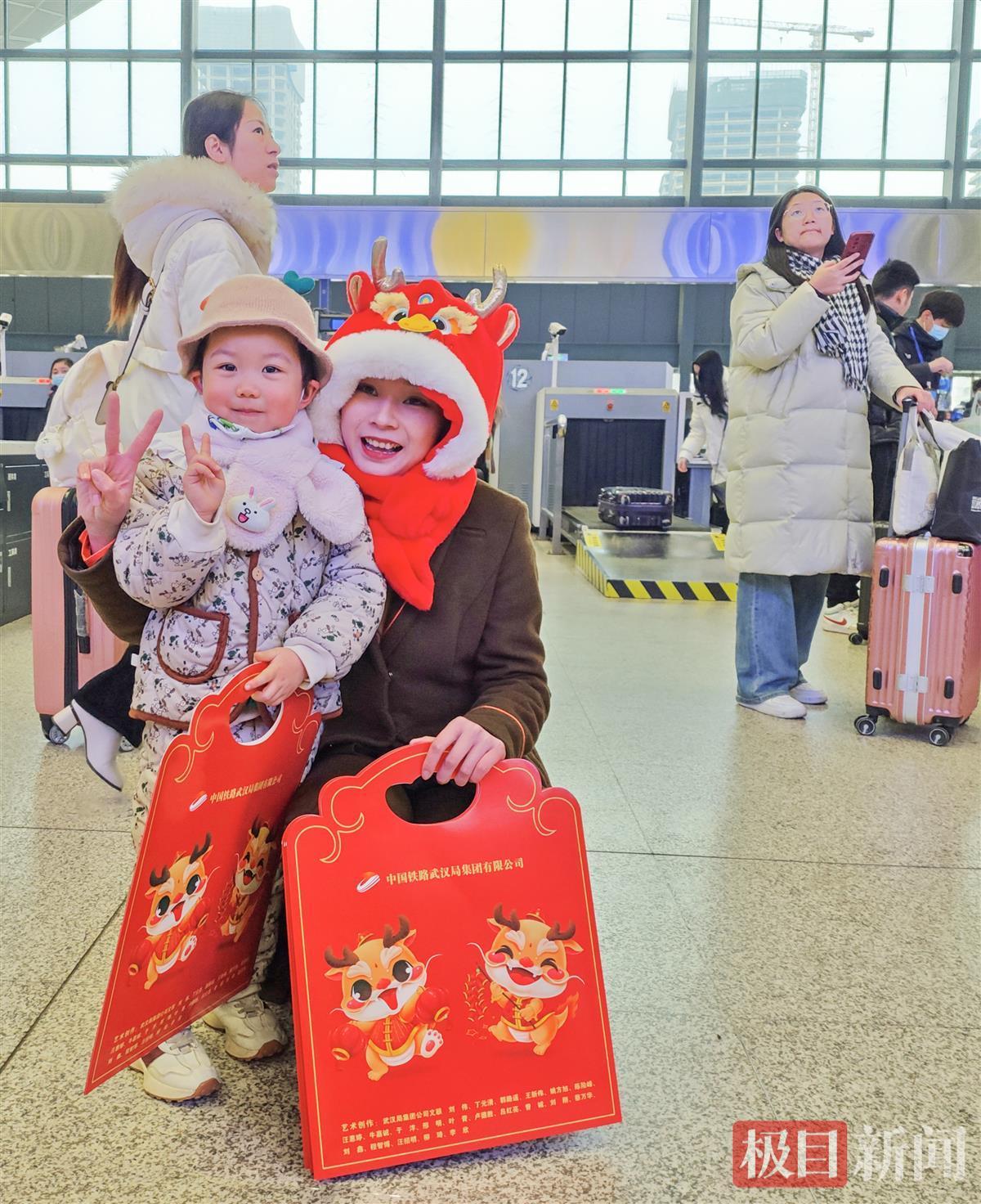 隨著春節日益臨近,各地年味越來越濃,武鐵管內各車站紛紛懸掛燈籠、張貼窗花,隨處可見龍年元素,洋溢著熱鬧喜慶的春節氛圍。在武漢站,進站口、候車室等區域懸掛著喜慶的大紅燈籠和福字窗花,旅客一走進大廳就感受到濃濃的年味;在漢口站,82個大紅燈籠、180余張龍年窗花、20余個中國節,將百年老站裝扮一新,喜迎旅客;在襄陽站、襄陽東站候車室,溫馨漂亮的“龍騰四海、新年大吉”龍年主題裝飾展臺吸引了許多旅客打卡留影,旅客在文創書簽上寫下新年愿望,客運人員向旅客贈送裝有襄陽特產的龍年福袋。