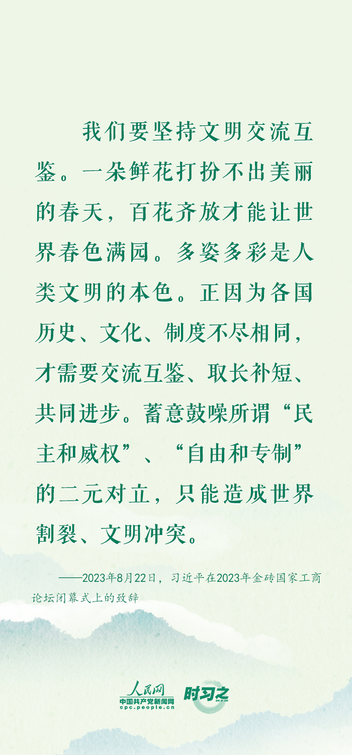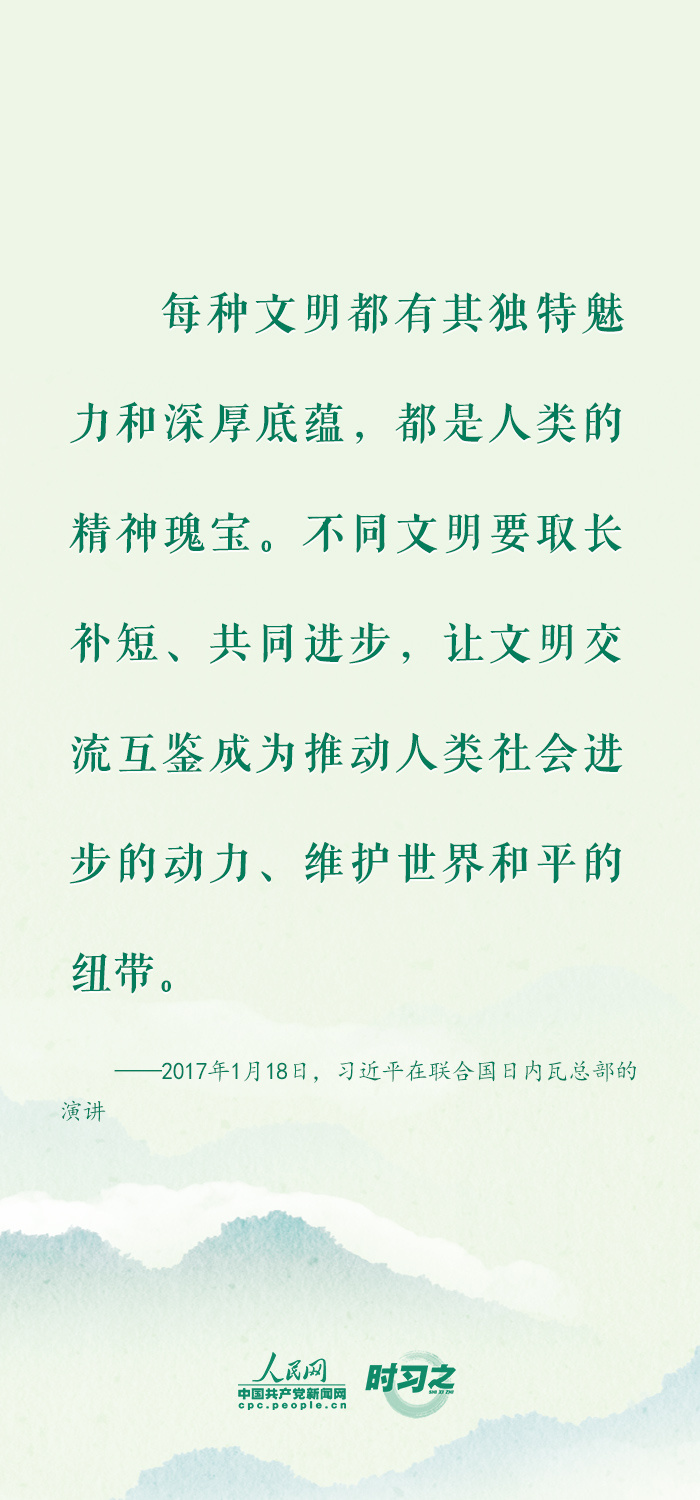 文化因交流而多彩,文明因互鑒而豐富。習(xí)近平在不同場合多次發(fā)表重要講話,推動(dòng)不同國家、不同民族、不同文化間加強(qiáng)交流互鑒,共同繪就美美與共的人類文明畫卷。