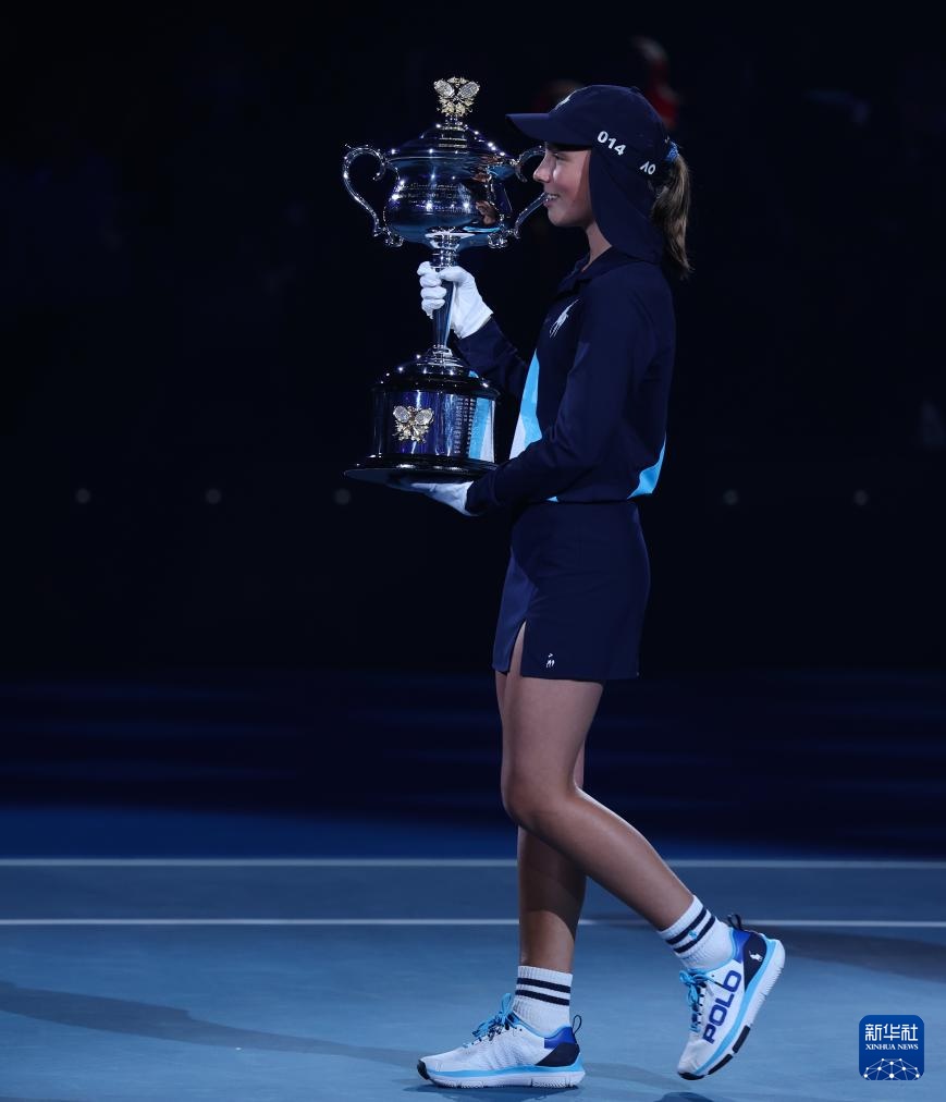 1月27日,球童在賽前展示女單冠軍達芙妮·阿克赫斯特紀念杯。新華社記者 馬平 攝