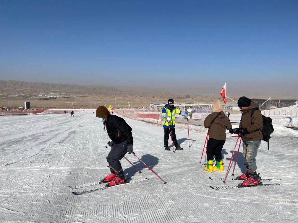 大漠戈壁中,皚皚白雪連成一片,錯落有致地鋪展在周圍黃褐色的丘陵之上。在國家雪上項(xiàng)目訓(xùn)練基地,工作人員為大家講解了雪具使用、滑雪基本技巧和冰雪運(yùn)動常識等知識,學(xué)生和家長還體驗(yàn)了滑雪、堆雪人和雪地足球等活動。