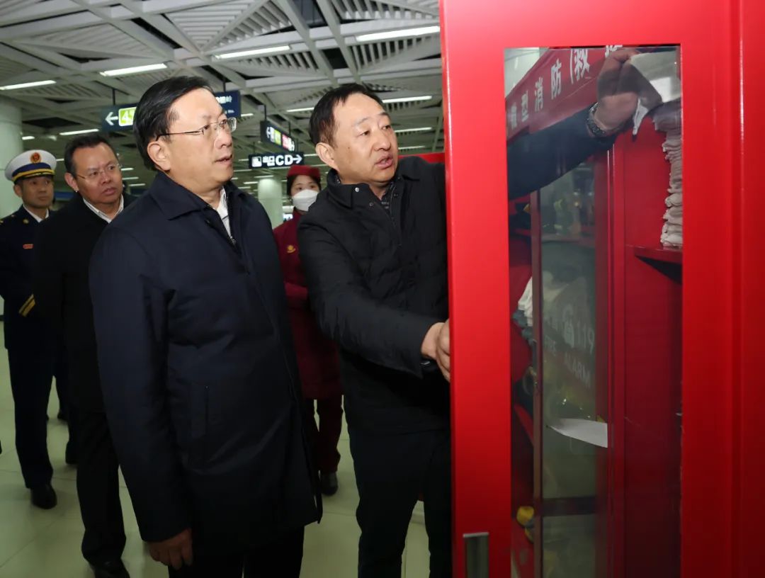 洪山廣場地鐵站為地鐵2號線和4號線的換乘站,人流如織。王忠林仔細檢查安全設施配備、人員培訓、值班值守等情況,聽取武漢地鐵安全運營工作匯報。他指出,軌道交通是保障城市運行的重要系統,要進一步提升安全運營管理水平,及時排查容易引發群死群傷的“火、淹、撞、擠”等風險隱患,加強車輛運行科學調度、設施設備日常檢查、全員安全培訓教育和常態化應急演練,強化群眾平安出行宣傳,醒目標示消防設施、安全通道等,為廣大市民提供安全舒適的出行服務。