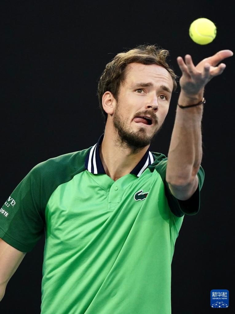 1月28日,梅德韋杰夫在比賽中發(fā)球。新華社記者 王申 攝