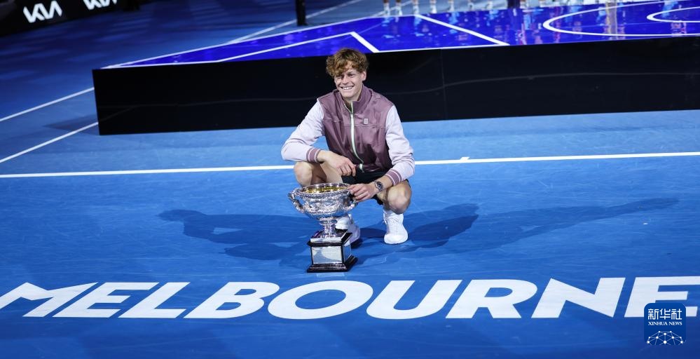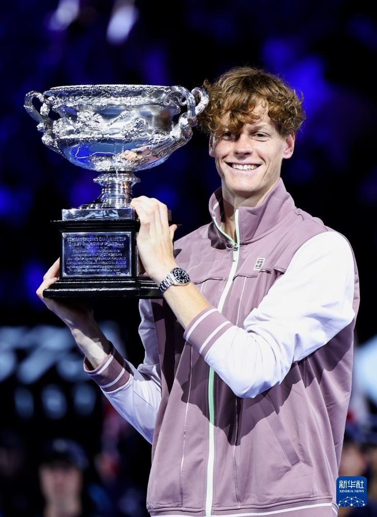 1月28日,辛納手舉獎杯慶祝。新華社記者 王申攝