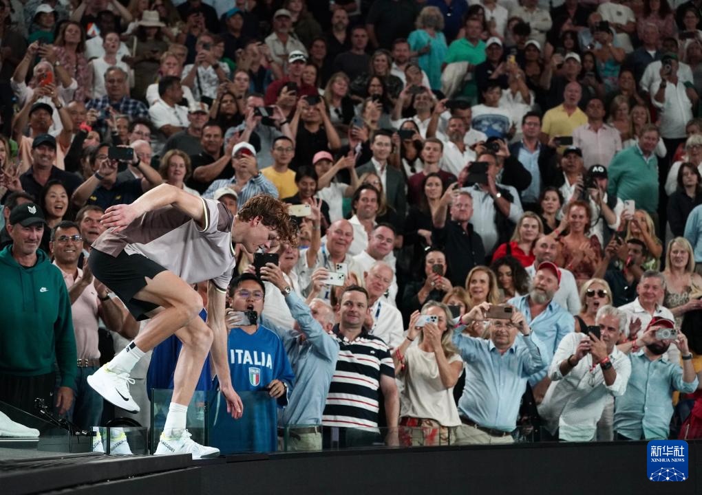 1月28日,辛納獲勝后爬上觀眾席。新華社記者 王申攝
