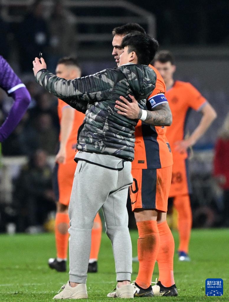 1月28日,國際米蘭隊球員勞塔羅與一名在比賽中闖入場地的球迷合影。新華社發(阿爾貝托·林格利亞攝)
