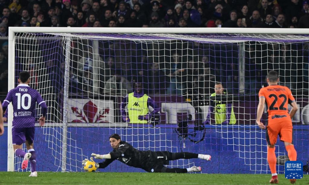1月28日,國際米蘭隊守門員索默(中)撲住了佛羅倫薩隊球員尼古拉斯·岡薩雷斯(左)在比賽中主罰的點球。新華社發(阿爾貝托·林格利亞攝)