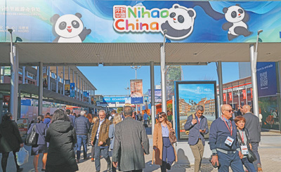 會(huì)展中心外側(cè)主通道的顯著位置,印有“你好!中國”國家旅游形象圖案的廣告牌。 本報(bào)記者 許海林?jǐn)z |