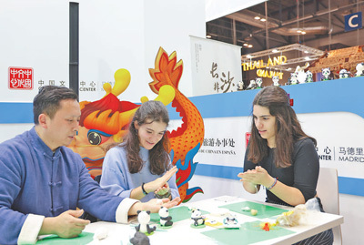 在中國展臺(tái),來自湖南的金杵面塑手藝人正在教觀眾基本的面塑技藝,制作大熊貓?jiān)煨偷募o(jì)念品。 本報(bào)記者 顏 歡攝 |