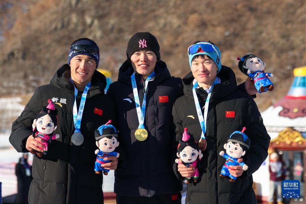 1月30日,冠軍吉林選手張成浩(中)、亞軍新疆選手依斯馬爾·托合塔爾艾力(左)、季軍山東選手劉建賓在頒獎儀式上合影。新華社記者 王楷焱 攝