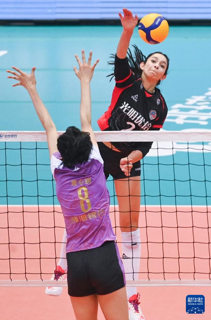 1月30日,上海光明優倍隊球員高意(左)在比賽中扣球。新華社記者 趙子碩 攝