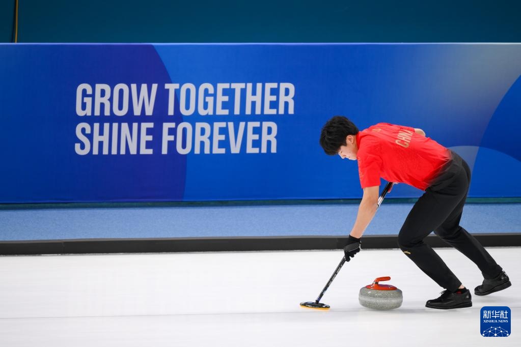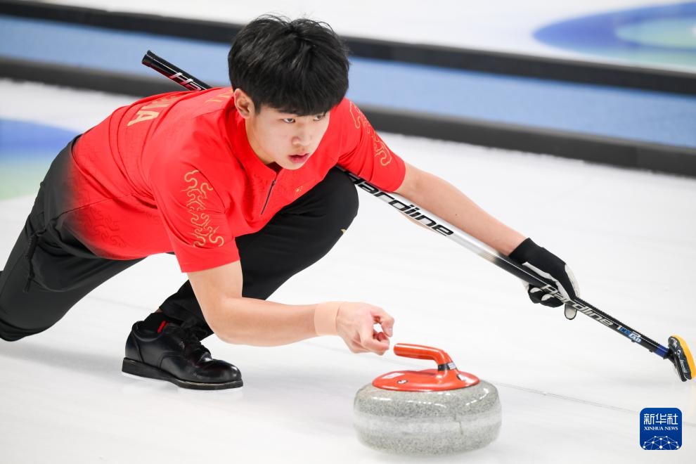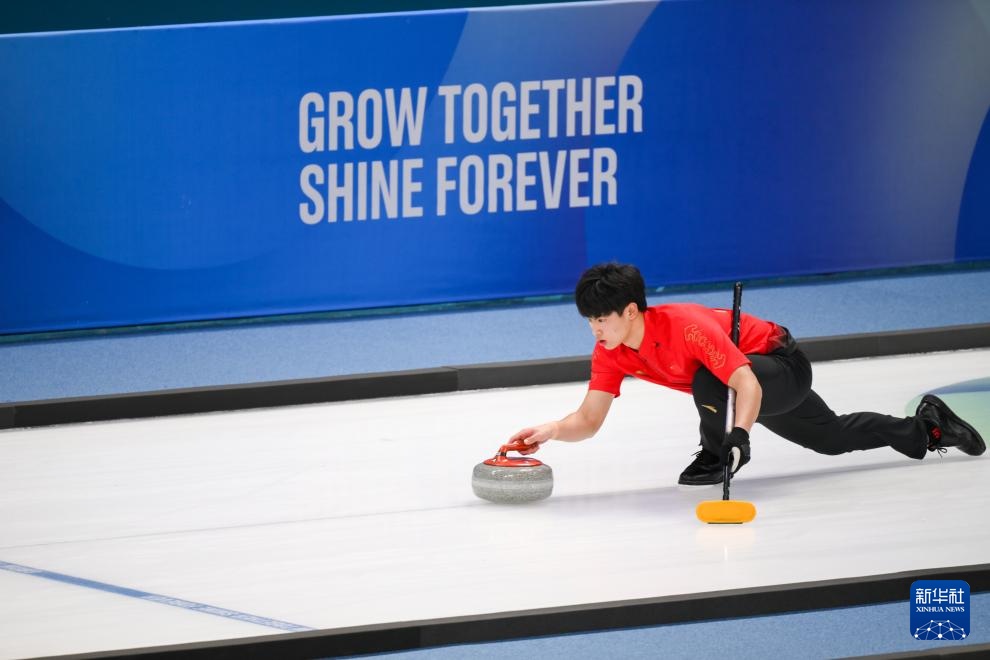 1月31日,中國選手許博康在比賽中擲冰壺。新華社記者 朱煒 攝