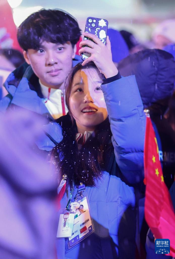 2月1日,中國運動員在閉幕式上留影。新華社記者 姚琪琳 攝