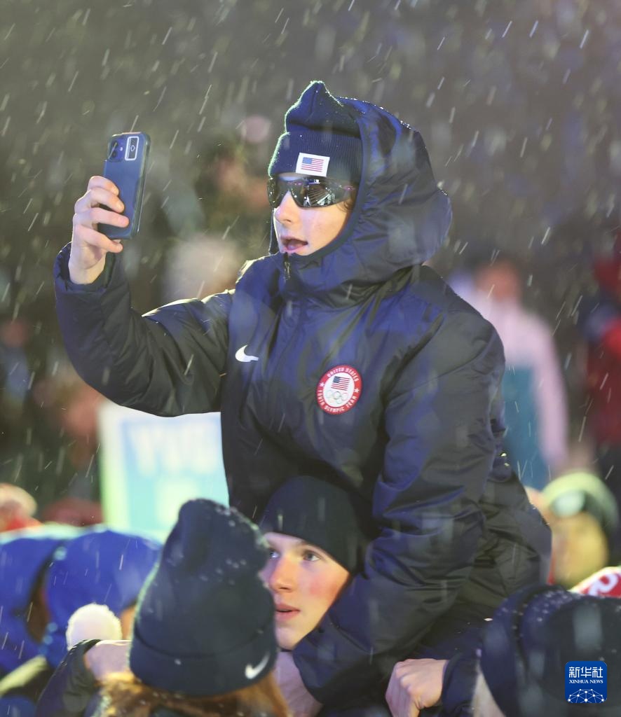 2月1日,一名美國運動員在閉幕式上拍照。新華社記者 姚琪琳 攝