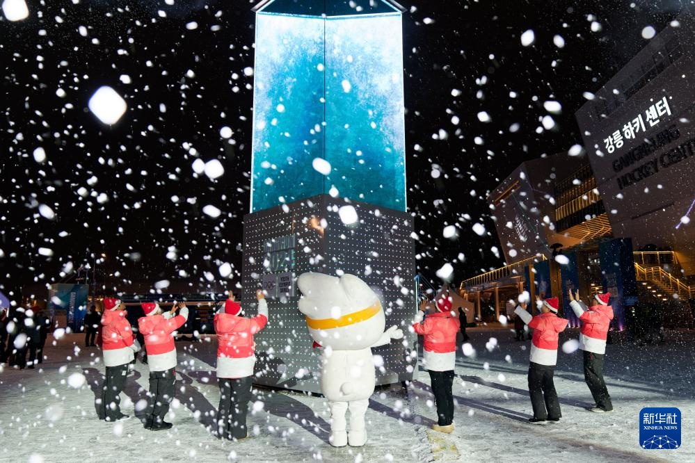 2月1日,冬青奧會吉祥物“萌吉奧”和志愿者向電子火炬拋灑雪花以熄滅電子火炬。新華社記者 張笑宇 攝