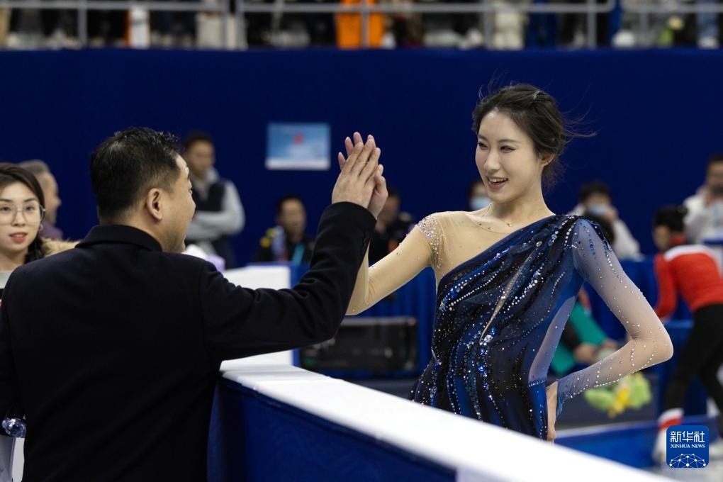 2月2日,中國選手陳虹伊(右)在自由滑比賽后和教練擊掌。最終,她位列女子單人滑第13。新華社記者 王翔 攝