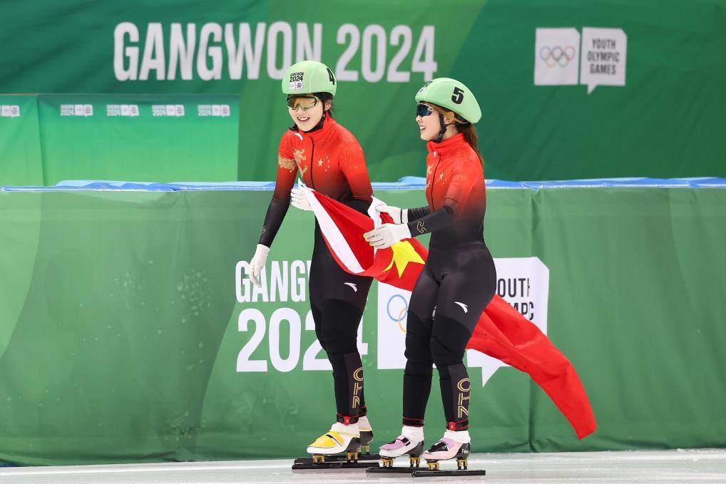 1月20日,中國選手楊婧茹(右)與李金恣在比賽后慶祝。新華社記者 許雅楠 攝