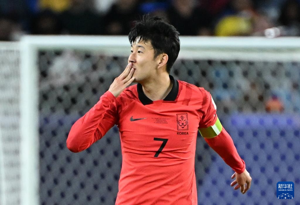 2月2日,韓國隊(duì)球員孫興慜(前左)在加時賽中主罰任意球得分后。新華社記者 賈浩成 攝