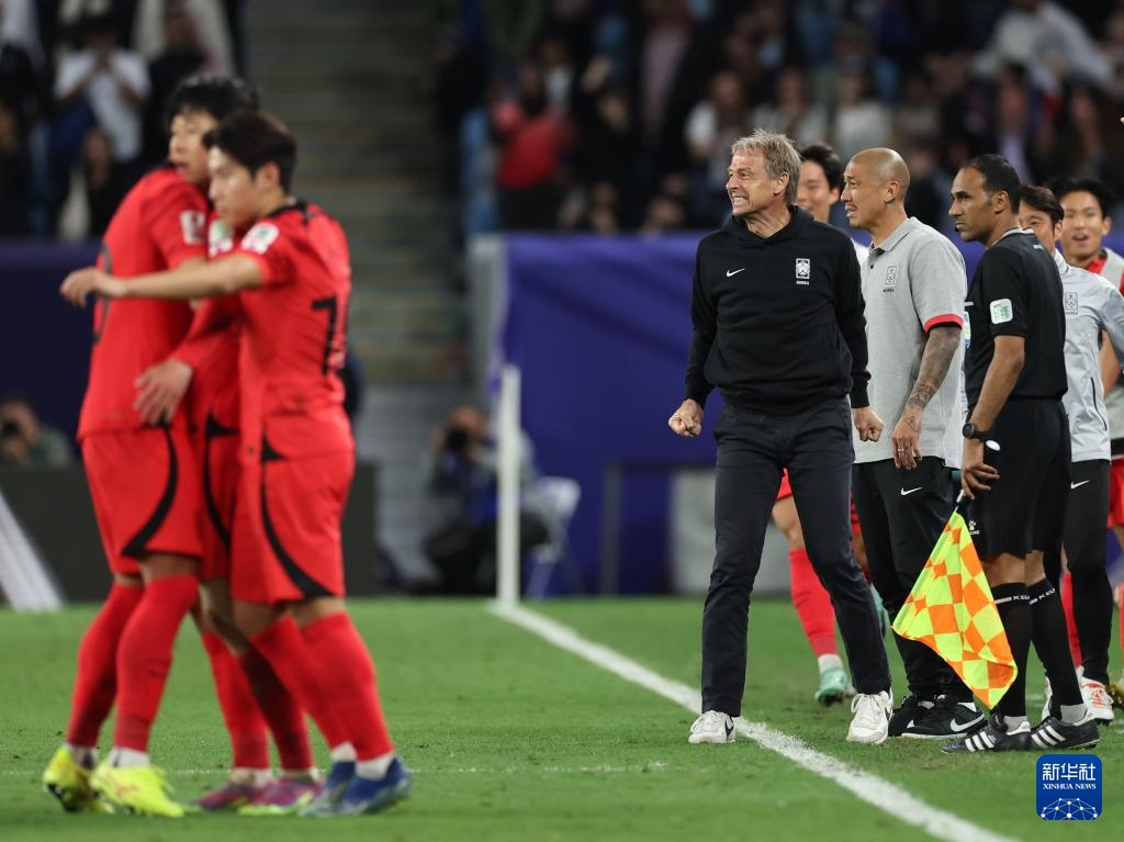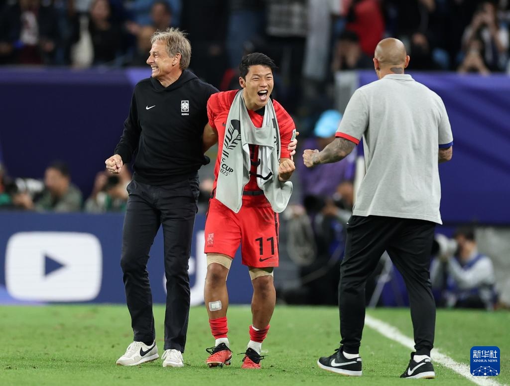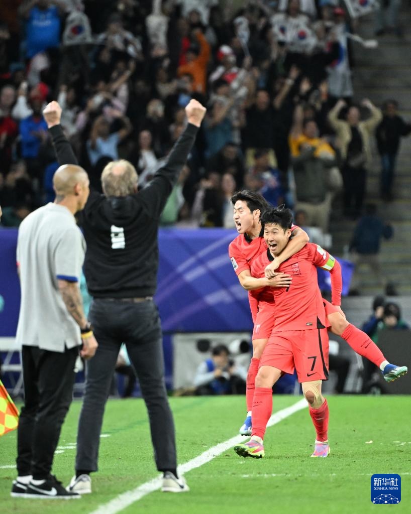 2月2日,韓國隊(duì)主教練尤爾根·克林斯曼(中)慶祝球員孫興慜在加時賽中進(jìn)球。新華社記者 賈浩成 攝
