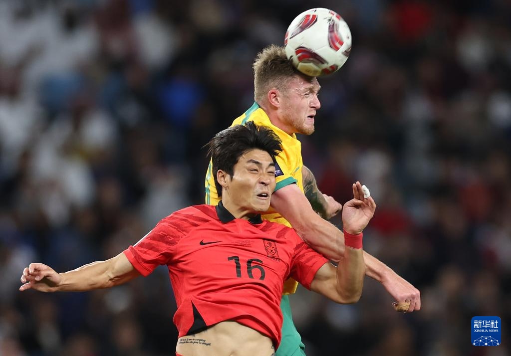2月2日,韓國隊(duì)球員樸鎮(zhèn)燮(前)與澳大利亞隊(duì)球員哈里·蘇塔在比賽中爭頂。新華社記者 賈浩成 攝