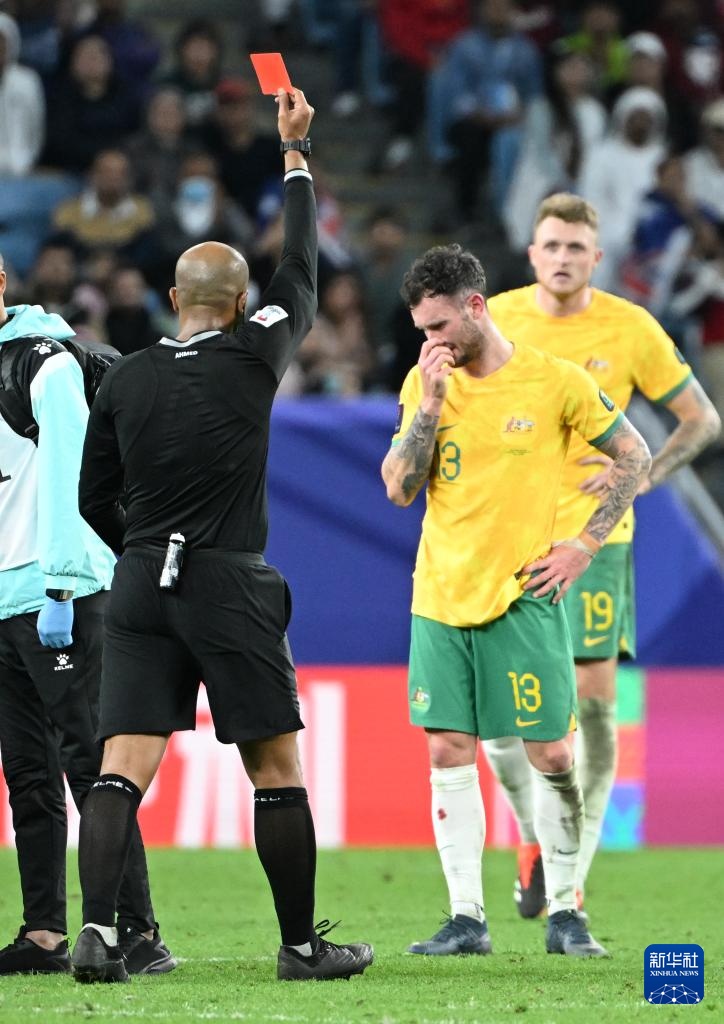 2月2日,主裁判艾哈邁德 ·巴卡爾向澳大利亞隊(duì)球員艾登·奧尼爾(右二)出示紅牌。新華社記者 孫凡越 攝