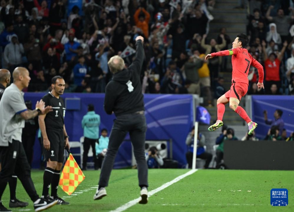 2月2日,韓國隊(duì)球員孫興慜(右)在加時賽中主罰任意球得分后慶祝。新華社記者 孫凡越 攝