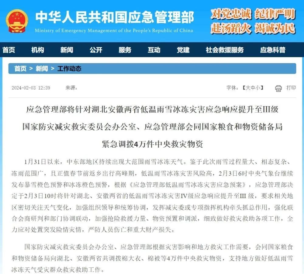應急管理部將針對湖北安徽兩省低溫雨雪冰凍災害應急響應提升至Ⅲ級