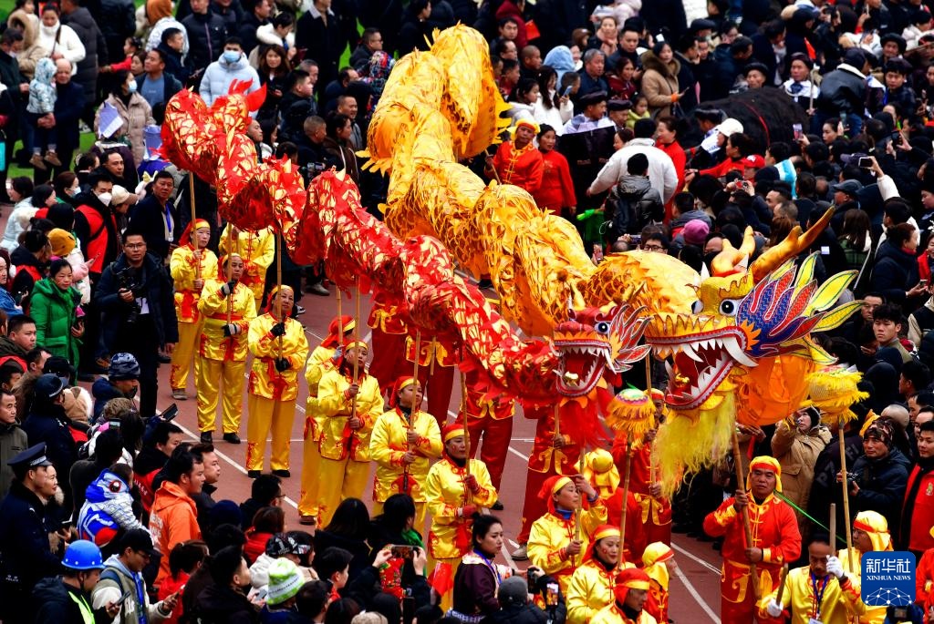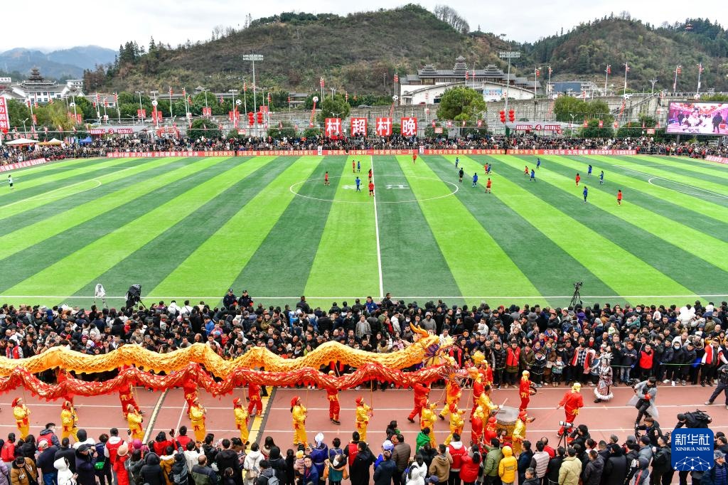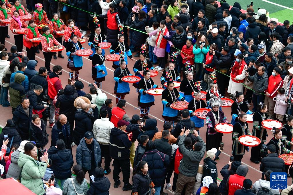 2月3日,村民組成的表演隊(duì)身著民族服裝進(jìn)入活動現(xiàn)場。新華社記者 劉續(xù) 攝