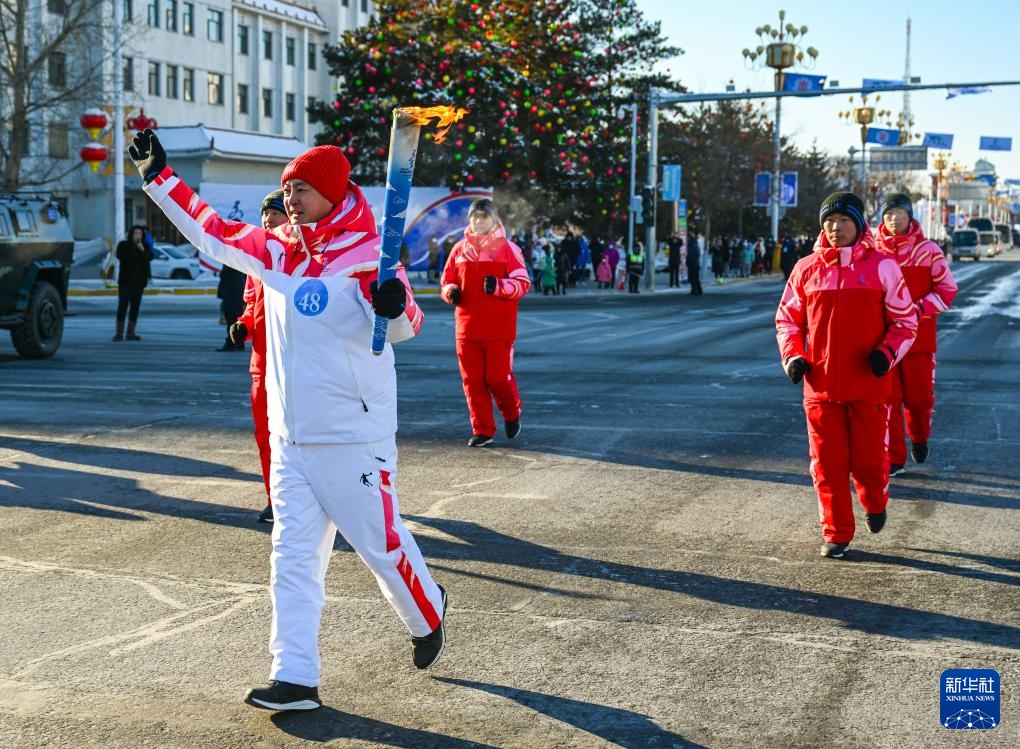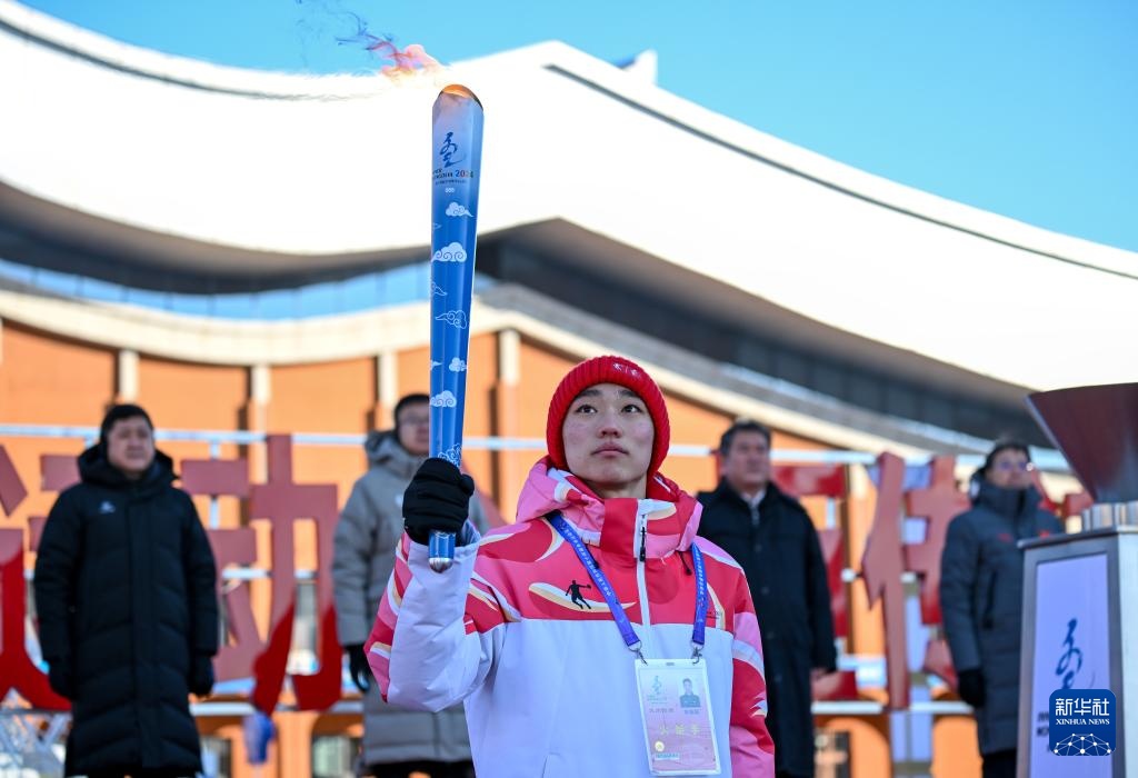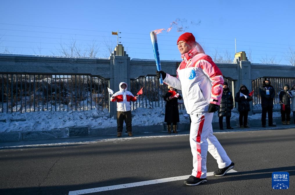 2月3日,在內蒙古呼倫貝爾市滿洲里國門景區,火炬手錢卓在火炬傳遞活動中。新華社記者 連振 攝