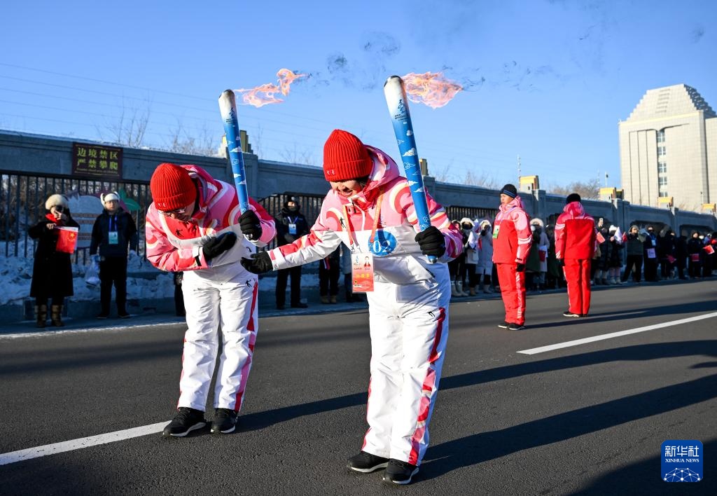 2月3日,在內蒙古呼倫貝爾市滿洲里國門景區,火炬手包玲玲(右)和錢卓在火炬傳遞活動中。新華社記者 連振 攝