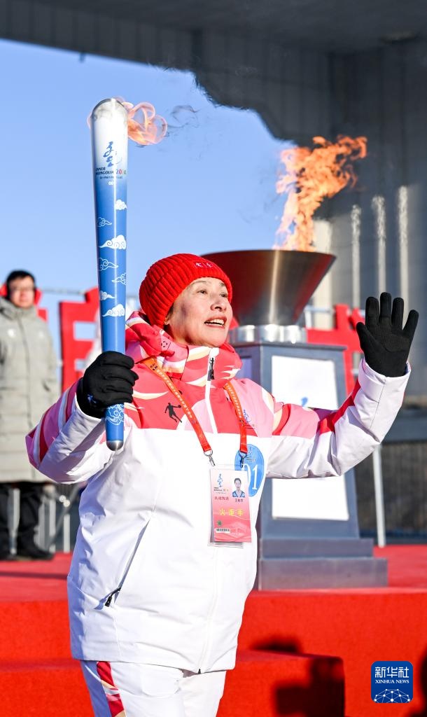 2月3日,在內蒙古呼倫貝爾市滿洲里國門景區,第一棒火炬手王桂芳在火炬傳遞活動中。新華社記者 連振 攝