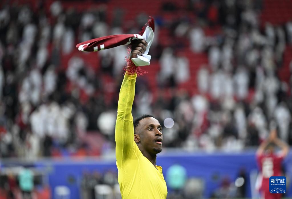 2月3日,卡塔爾隊(duì)守門(mén)員邁沙阿勒·巴沙姆在比賽勝利后慶祝。新華社記者 孫凡越 攝