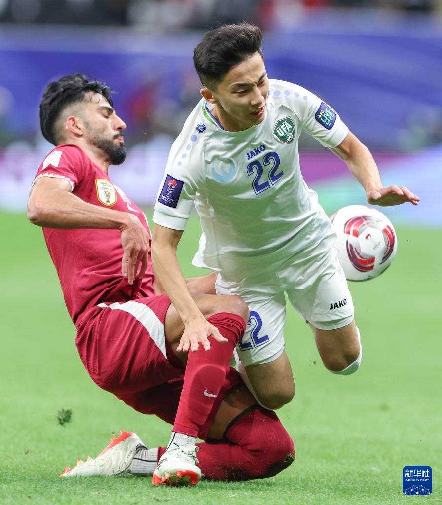 2月3日,烏茲別克斯坦隊(duì)球員法伊祖拉耶夫(右)與卡塔爾隊(duì)球員塔里克·薩勒曼在比賽中拼搶。新華社記者 丁汀 攝