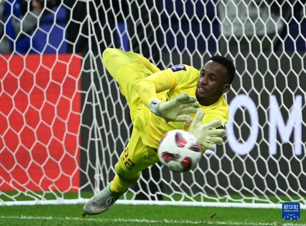 2月3日,卡塔爾隊(duì)守門(mén)員邁沙阿勒·巴沙姆在點(diǎn)球大戰(zhàn)中撲出烏茲別克斯坦隊(duì)的點(diǎn)球。新華社記者 孫凡越 攝