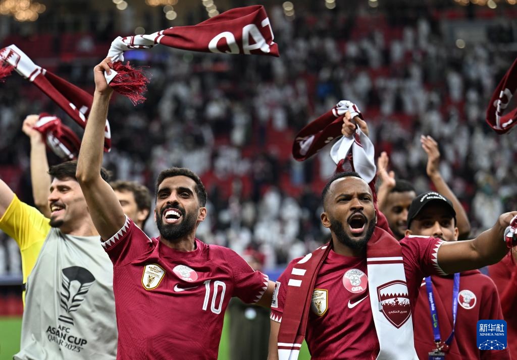 2月3日,卡塔爾隊(duì)在比賽獲勝后慶祝。新華社記者 孫凡越 攝