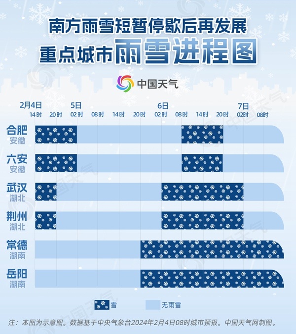 從中國天氣網推出的重點城市雨雪進程圖可以看到,湖南常德、岳陽今天下午雨雪就會停歇,明天晚上降雪又會再度發展;湖北武漢、荊州的降雪將在今天晚上逐漸停止,6日凌晨到白天又會出現明顯降雪;安徽的合肥、六安明天凌晨降雪停歇,6日上午又會迎來新一輪降雪過程。
