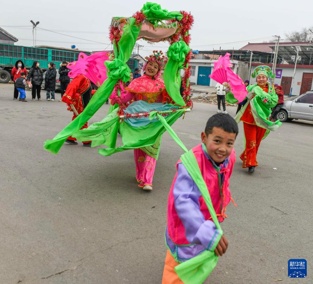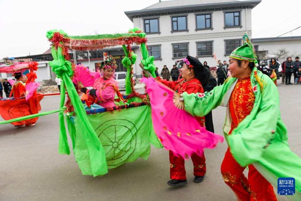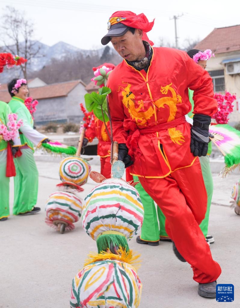 2月4日,河北省遵化市湯泉滿族鄉(xiāng)關(guān)山口村民間藝人在表演太平車民俗節(jié)目。