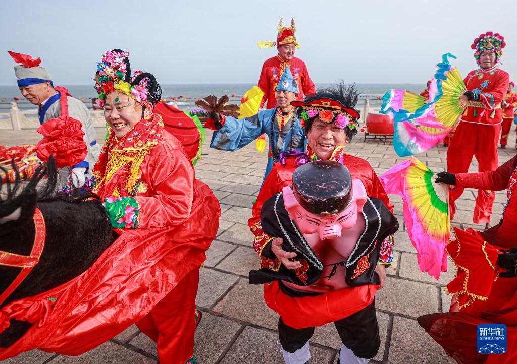 2月4日,在山東省榮成市成山頭風(fēng)景區(qū),民間藝人在進(jìn)行漁家秧歌、雜耍表演。