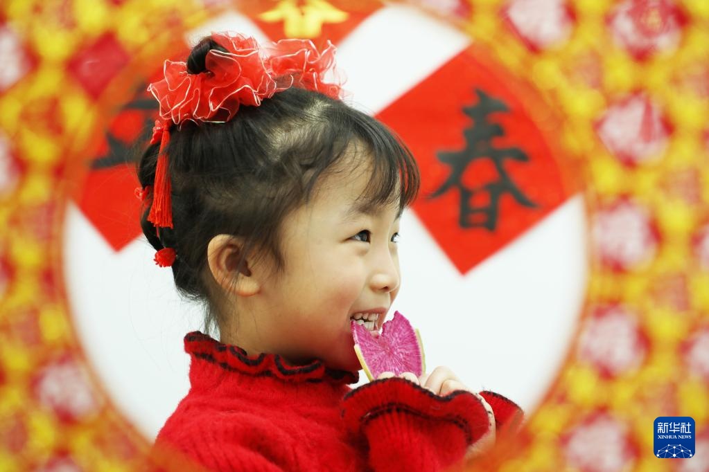 2月4日,在河北省唐山市豐潤區(qū)太平路街道紡織二社區(qū),小朋友在吃蘿卜“咬春”。