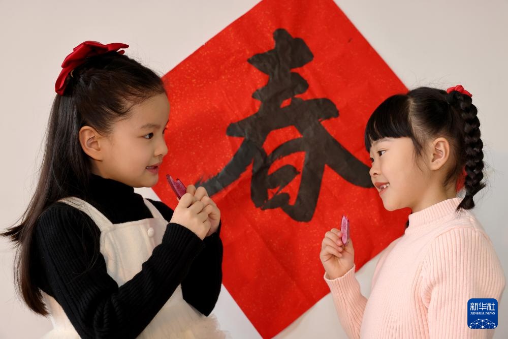 2月4日,在山東省棗莊市光明路街道東盛社區(qū)活動室,兩名小朋友吃蘿卜“咬春”。