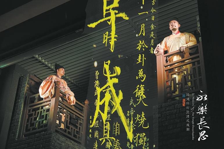 《永樂大典》是中國古代最大的類書,其正本成書于明永樂年間,副本重錄于嘉靖年間。但令人痛心的是,正本散軼至今下落不明,副本目前僅有400余冊、800余卷及部分零葉存世。為了把這部國寶文物飽受挫折又不斷浴火重生的歷史呈現(xiàn)給當(dāng)代觀眾,國家圖書館(國家典籍博物館)與白鏡戲局聯(lián)合出品了沉浸式戲劇《永樂長思》。