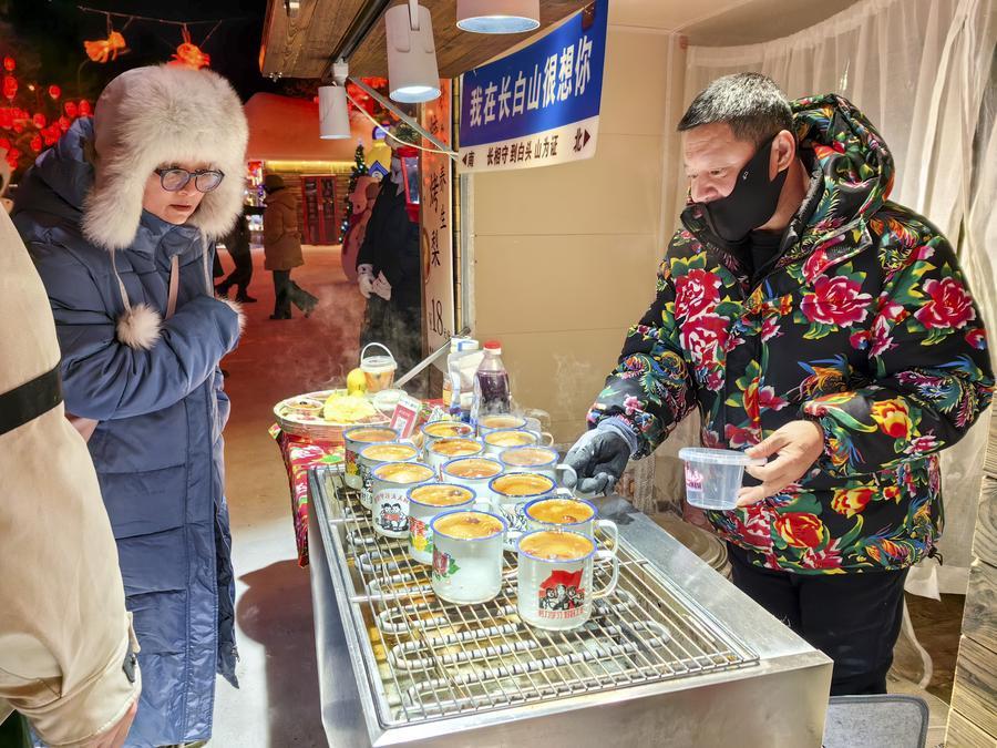 2月2日,游客在位于延邊朝鮮族自治州安圖縣二道白河鎮(zhèn)的“云頂市集”購買冰糖烤梨。新華社記者 王帆 攝