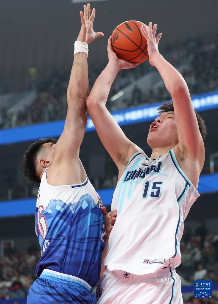 2月5日,新疆伊力特隊球員李炎哲(右)在青島國信水產隊球員楊瀚森的防守下投籃。新華社記者 胡虎虎 攝