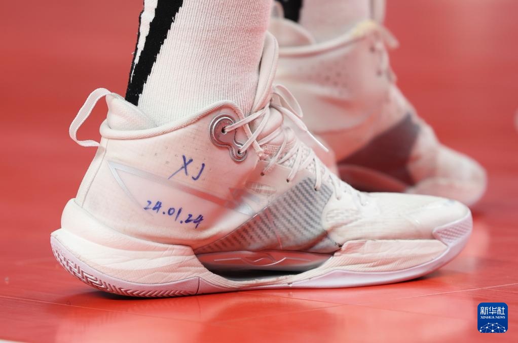 2月5日,球員李炎哲的球鞋上寫著他本賽季加盟新疆伊力特隊后的首場比賽日期。新華社記者 胡虎虎 攝