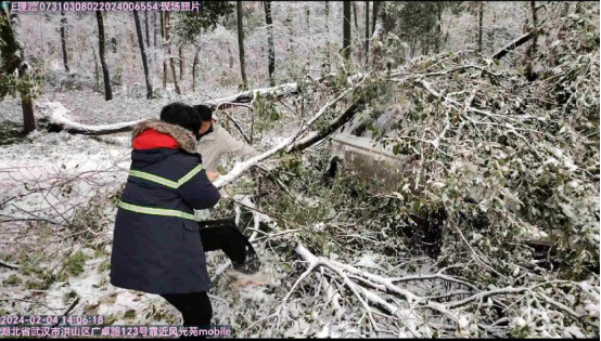 武漢查勘員李文逸為了減少客戶車輛的,主動幫助客戶清理車上因積雪壓斷的樹枝。