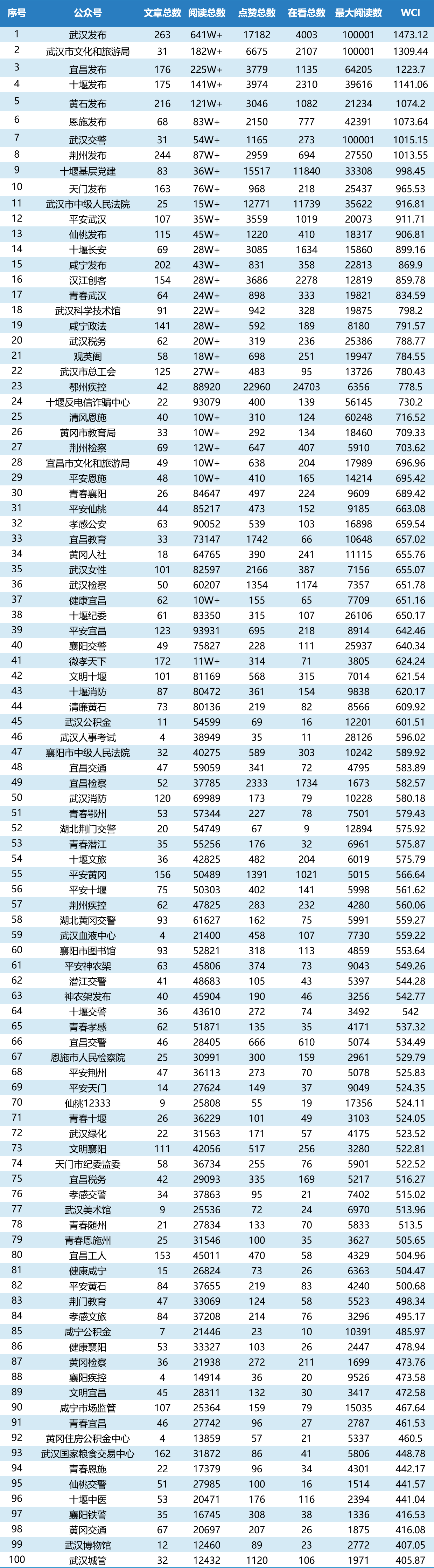 圖:湖北市州微信排行榜TOP100
