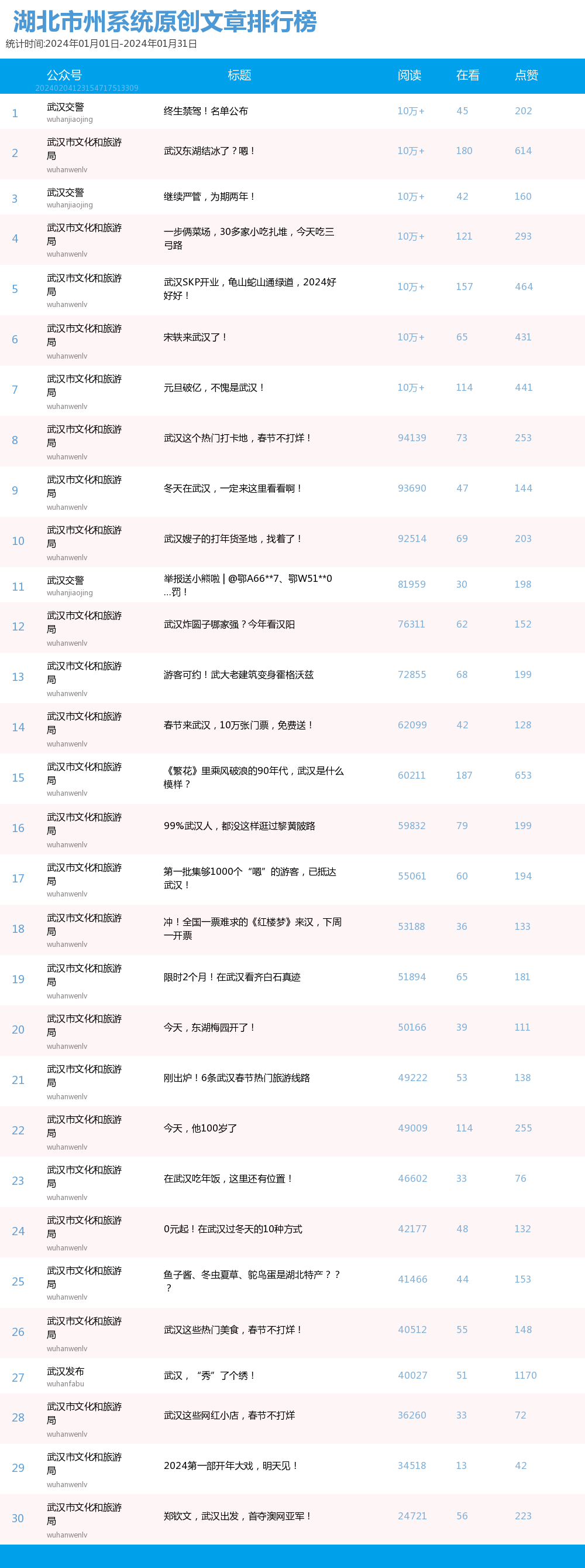 從原創文章排行榜看,本期上榜文章來自3個賬號,分別是“武漢市文化和旅游局”“武漢交警”“武漢發布”。其中,榜單前30篇中有26篇來自“武漢市文化和旅游局”,較上期增加3篇;“武漢交警”3篇,與上期保持不變;“武漢發布”1篇,較上期減少1篇。本期,閱讀量“10萬+”原創爆款文章數量共計7篇,較上月增加5篇,其中“武漢市文化和旅游局”5篇。原創文章閱讀量前10名中,“武漢交警”發布文章《終生禁駕!名單公布》《繼續嚴管,為期兩年!》分別位居榜首與探花;“武漢市文化和旅游局”以《武漢東湖結冰了?嗯!》《一步倆菜場,30多家小吃扎堆,今天吃三弓路》《武漢SKP開業,龜山蛇山通綠道,2024好好好!》《宋軼來武漢了!》等文章包攬余下8個名次。