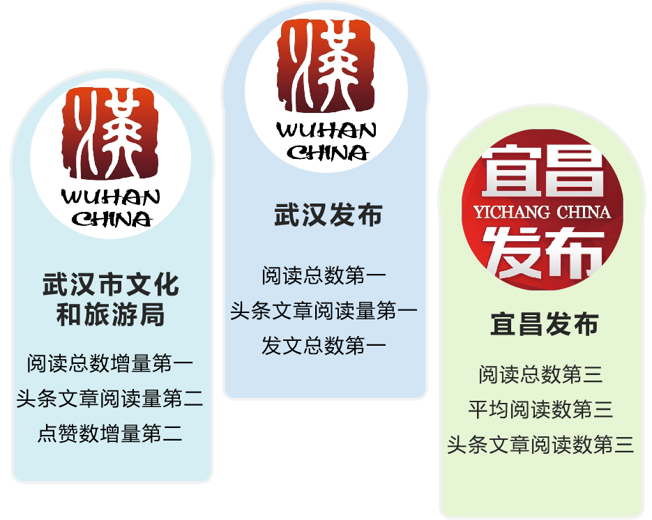 從閱讀總數來看,超五成賬號閱讀量增長,共有57個賬號正向增長,較上期增加1個。其中,“武漢發布”閱讀總數641萬+一馬當先;“宜昌發布”閱讀總數225萬+,位居第二;“武漢市文化和旅游局”閱讀總數182萬+;“十堰發布”“黃石發布”仍保持超百萬閱讀量,在閱讀總數破百萬的5個賬號中,“武漢市文化和旅游局”與“十堰發布”閱讀總數正向增長,2個賬號分別增長30萬與8萬以上。