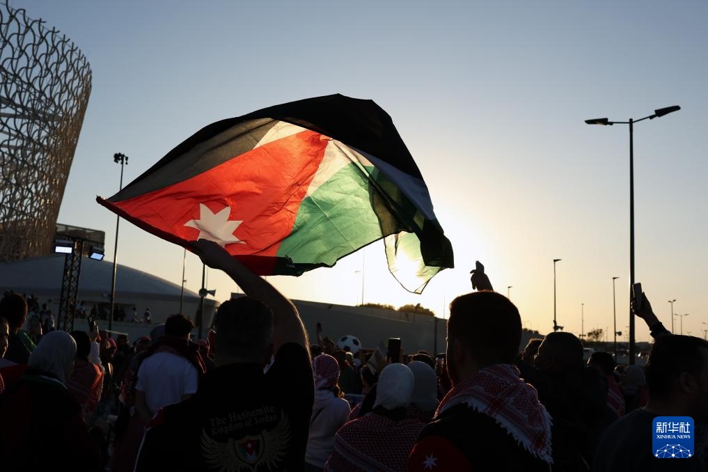 2月6日,約旦隊球迷在球場外揮舞約旦國旗。新華社記者 賈浩成 攝